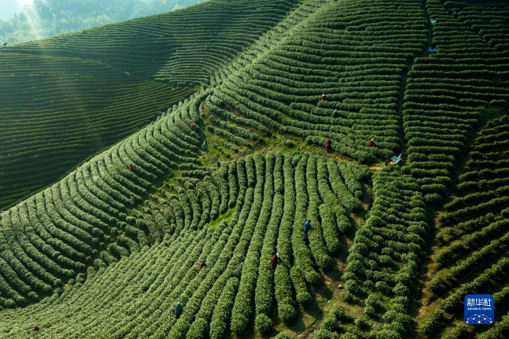3月26日,茶農(nóng)在浙江省湖州市吳興區(qū)妙西鎮(zhèn)茶園采茶(無(wú)人機(jī)照片)。