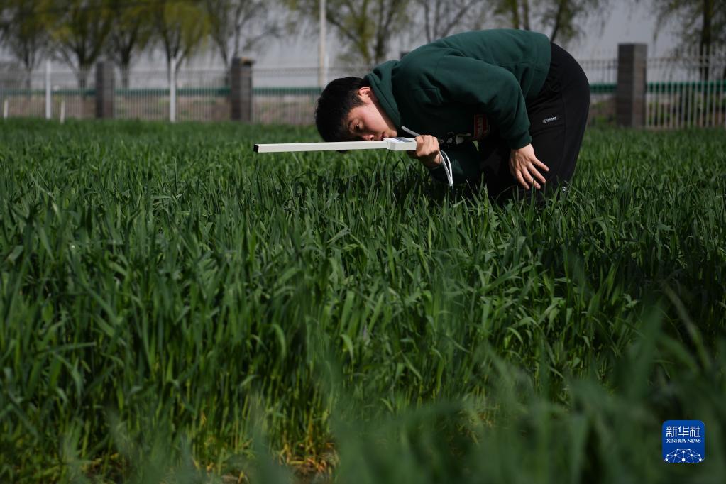 3月26日,在皖中綜合試驗站內(nèi),安徽農(nóng)業(yè)大學(xué)農(nóng)學(xué)院的學(xué)生在對小麥冠層進行測量。