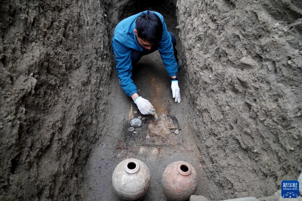 工作人員在宋國故城遺址內的唐代墓葬進行清理作業(3月25日攝)。新華社記者 李安 攝