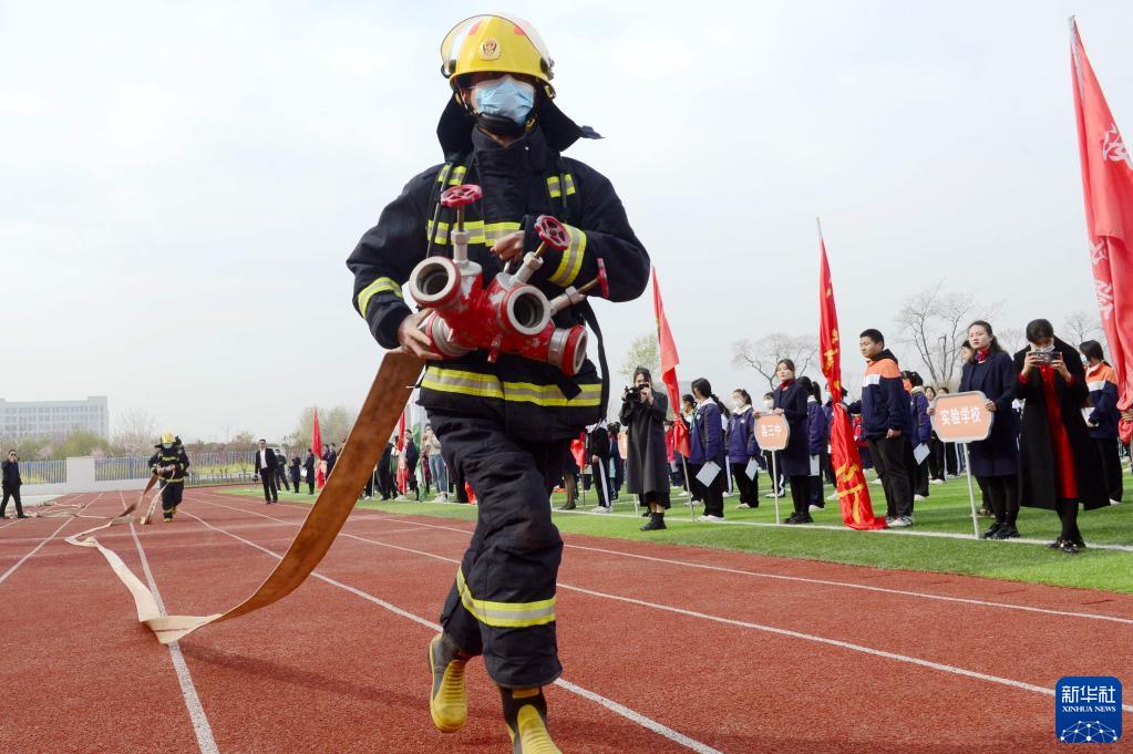 3月27日,在河南省駐馬店市汝南縣第三小學,消防員進行消防實操演示。