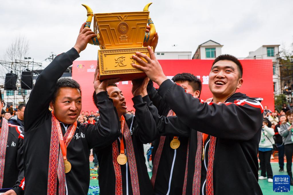 3月27日,冠軍黔東南州代表隊在“村BA”頒獎儀式上高舉獎杯慶祝。
