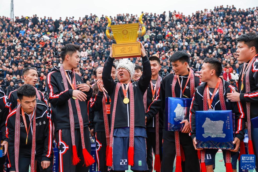 3月27日,冠軍黔東南州代表隊在“村BA”頒獎儀式上高舉獎杯慶祝。