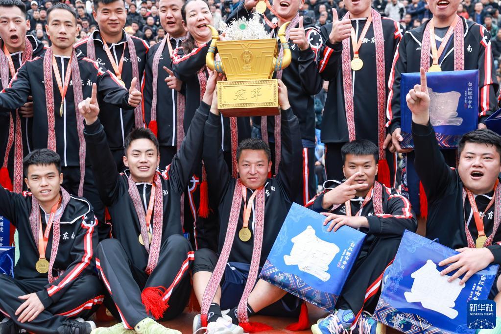 3月27日,冠軍黔東南州代表隊在“村BA”頒獎儀式上高舉獎杯慶祝。
