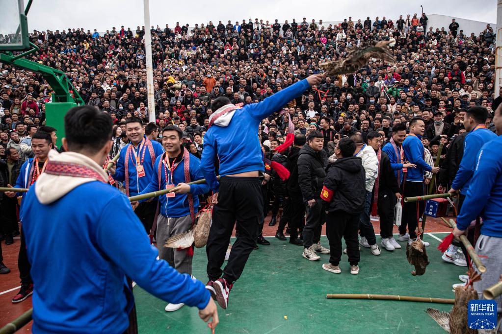 3月27日,季軍銅仁市代表隊(duì)球員在頒獎(jiǎng)儀式上將獎(jiǎng)品“三穗麻鴨”扔向觀眾席。