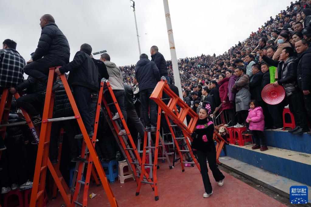 3月27日,觀眾在場邊搭梯子觀看比賽。