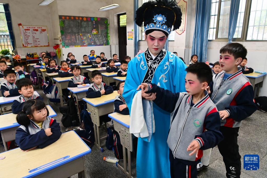 當日是世界戲劇日,江西省宜春市萬載縣花燈戲劇團演員來到當地第二小學,為學生們講解和表演花燈戲,讓孩子們近距離感受傳統戲劇文化的魅力。