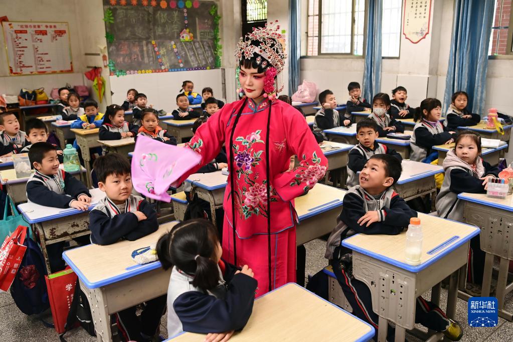 當日是世界戲劇日,江西省宜春市萬載縣花燈戲劇團演員來到當地第二小學,為學生們講解和表演花燈戲,讓孩子們近距離感受傳統戲劇文化的魅力。
