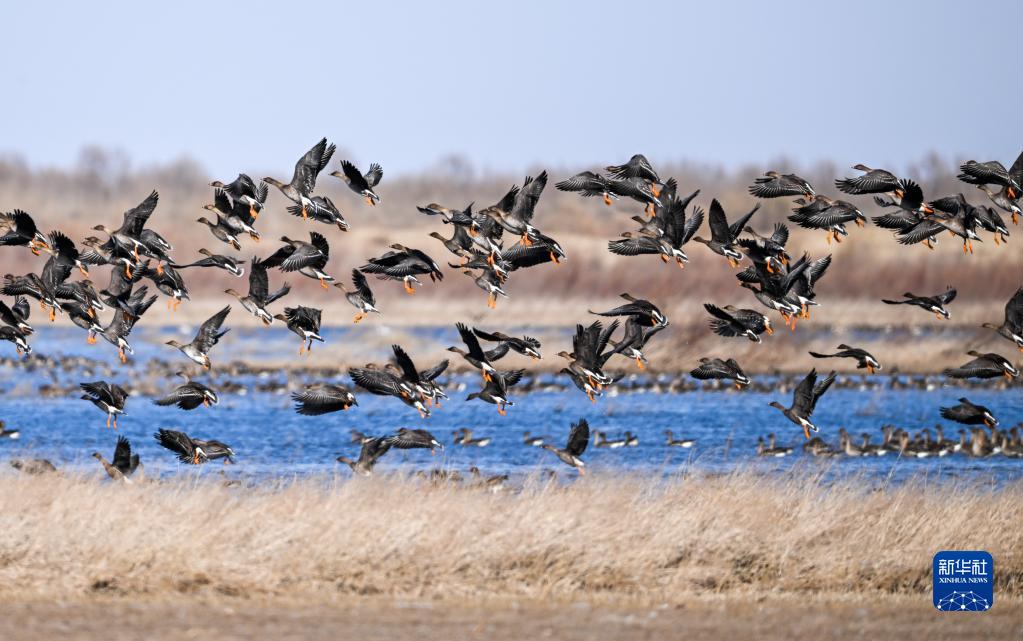 3月27日,成群的鴻雁在孟家段國家濕地公園飛翔。