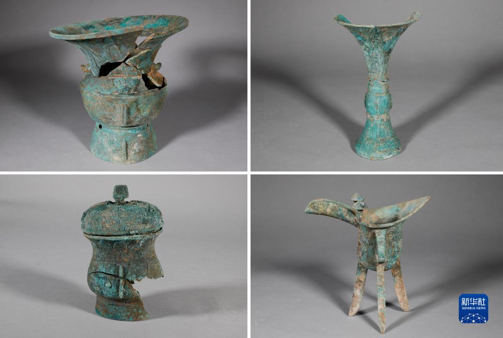 河南安陽殷墟商王陵祭祀坑K23出土的青銅器(拼版資料照片)。