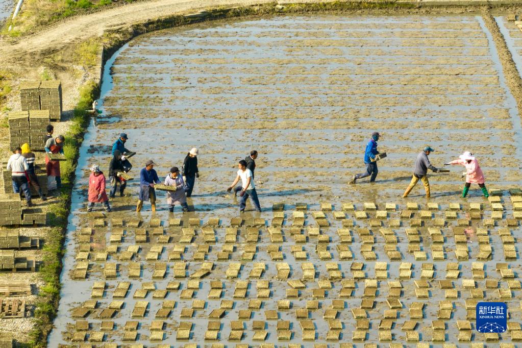 3月28日,在浙江省余姚市黃家埠鎮(zhèn)上塘村,農(nóng)民在稻田里擺放早稻機(jī)插秧盤(無人機(jī)照片)。