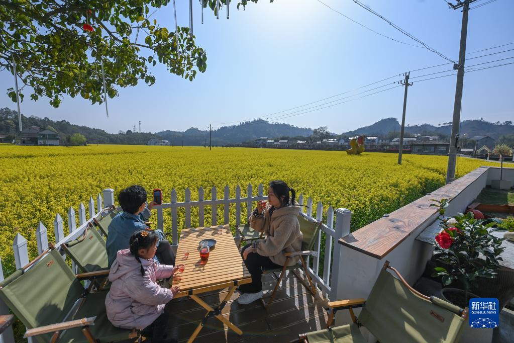 3月28日,在杭州市臨安區太陽鎮太陽米基地旁的一家民宿餐廳,客人在院子里喝茶賞景。