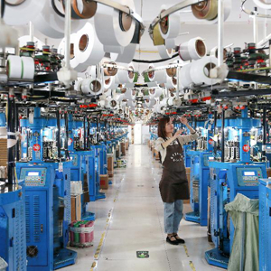3月28日,在淮北市杜集區石臺鎮農民工創業園,一家針織企業的工人在織襪車間作業。