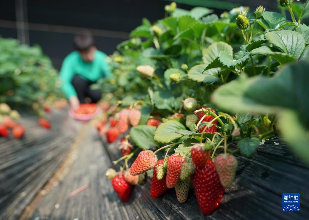 3月28日,游客在秦皇島市海港區海陽鎮一家庭農場的大棚內采摘草莓。