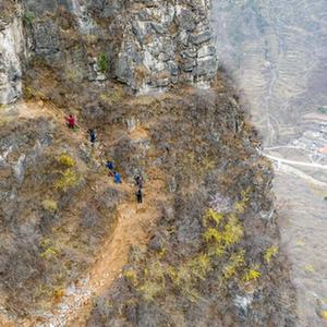 在位于山西省壺關縣大峽谷鎮青龍峽村的太行山上,村民沿著懸崖上山準備修路(無人機照片,3月23日攝)。