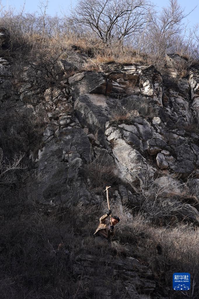 山西省壺關縣大峽谷鎮青龍峽村村民申森在清理路基上的雜物(3月8日攝)。新華社記者 詹彥 攝