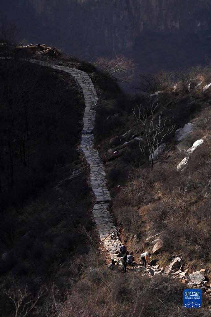 在山西省壺關縣大峽谷鎮青龍峽村,村民們在山上修路(3月8日攝)。新華社記者 詹彥 攝
