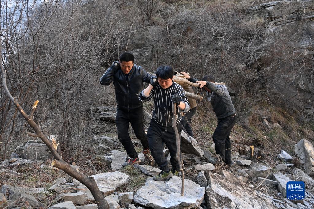 在位于山西省壺關縣大峽谷鎮青龍峽村的太行山上,村民挑著石塊運往修路現場(3月7日攝)。新華社記者 楊晨光 攝