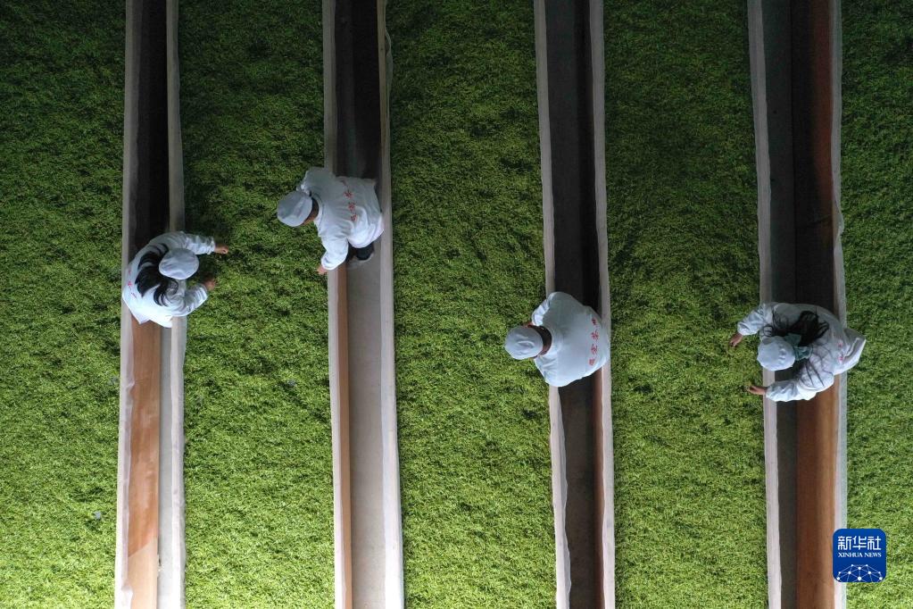 3月27日,在貴州省平塘縣通州鎮黨振村一茶葉加工廠,工人在攤晾茶青(無人機照片)。