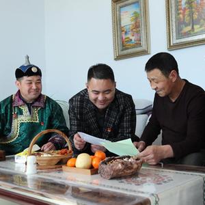 3月28日,在巴彥額日和圖嘎查的一戶牧民家里,嘎查黨支部書記寶音賀希格(左二)介紹鄉(xiāng)村振興相關(guān)政策。
