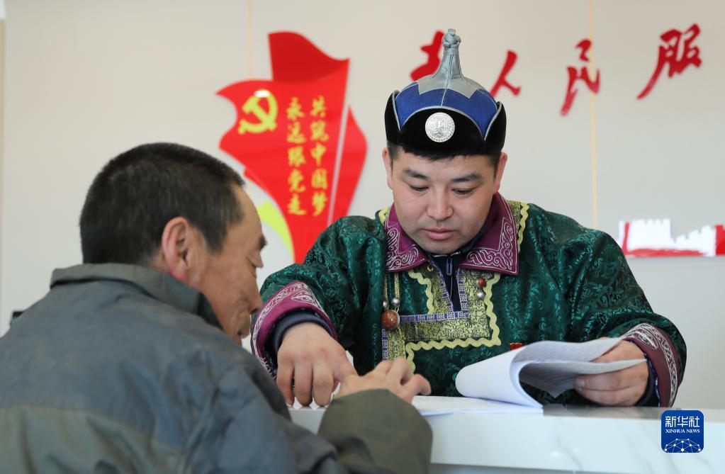 3月28日,在巴彥額日和圖嘎查黨群服務中心,一名黨員向牧民介紹相關政策。