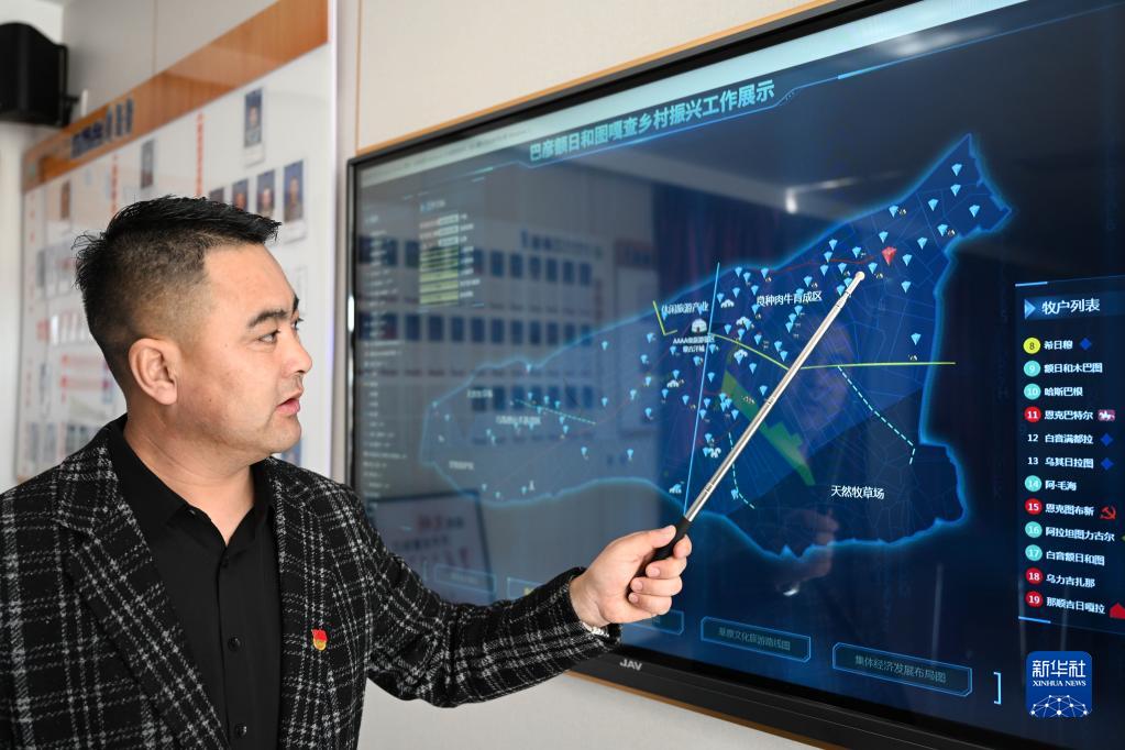 3月28日,在巴彥額日和圖嘎查黨群服務中心,嘎查黨支部書記寶音賀希格介紹轄區牧民情況。
