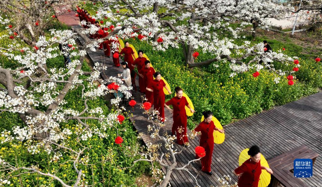3月28日,旗袍愛好者在石家莊市趙縣梨果生產(chǎn)基地觀光區(qū)表演旗袍秀(無人機照片)。