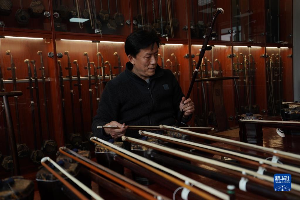 3月28日,制琴師卜廣軍在江蘇無錫梅村街道二胡產(chǎn)業(yè)園古月琴坊車間調(diào)試二胡。