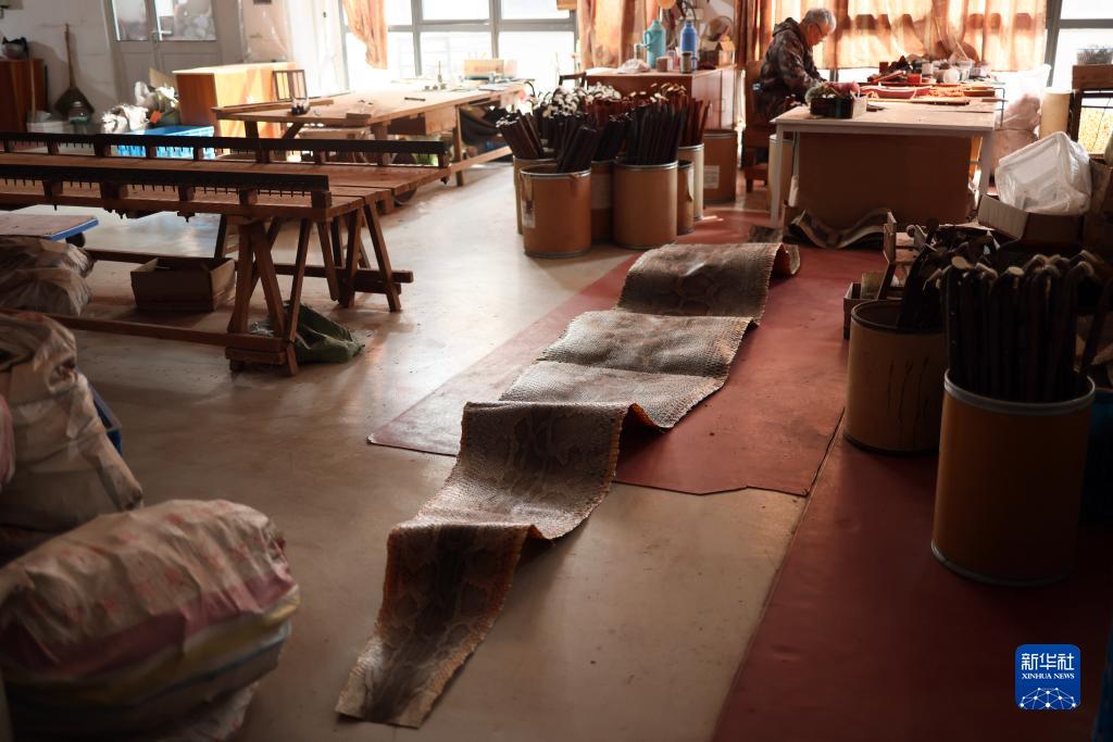 這是3月28日在江蘇無錫梅村街道二胡產業園拍攝的制作二胡用的蟒皮。