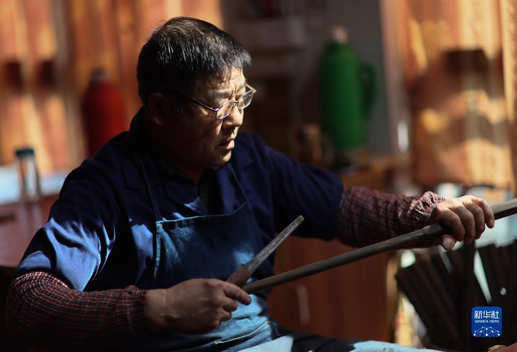 3月28日,在江蘇無錫梅村街道二胡產業園,工人在制作琴桿。