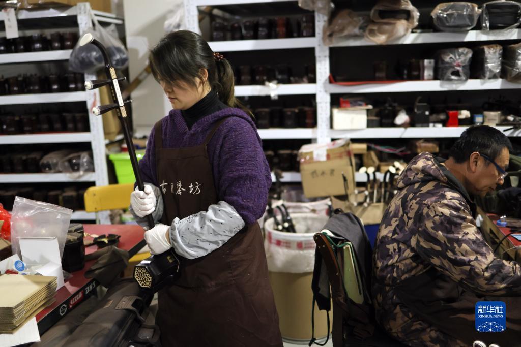 3月28日,在江蘇無錫梅村街道二胡產(chǎn)業(yè)園,工人在檢查成品二胡。