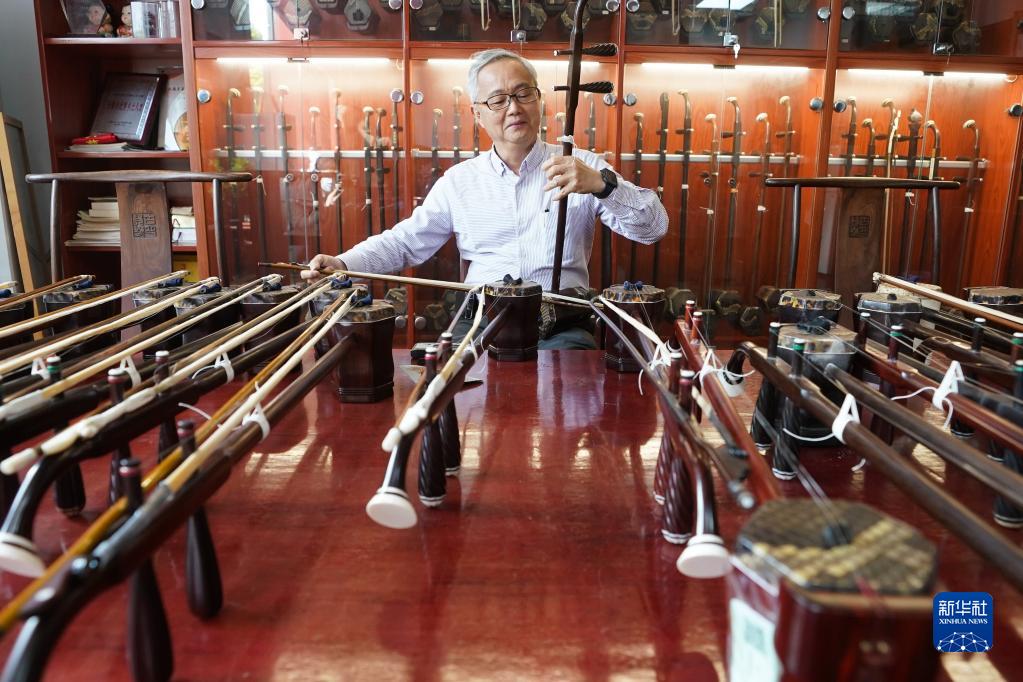 3月28日,在江蘇無錫梅村街道二胡產(chǎn)業(yè)園古月琴坊車間,來自香港的樂器經(jīng)銷商李開在試琴。
