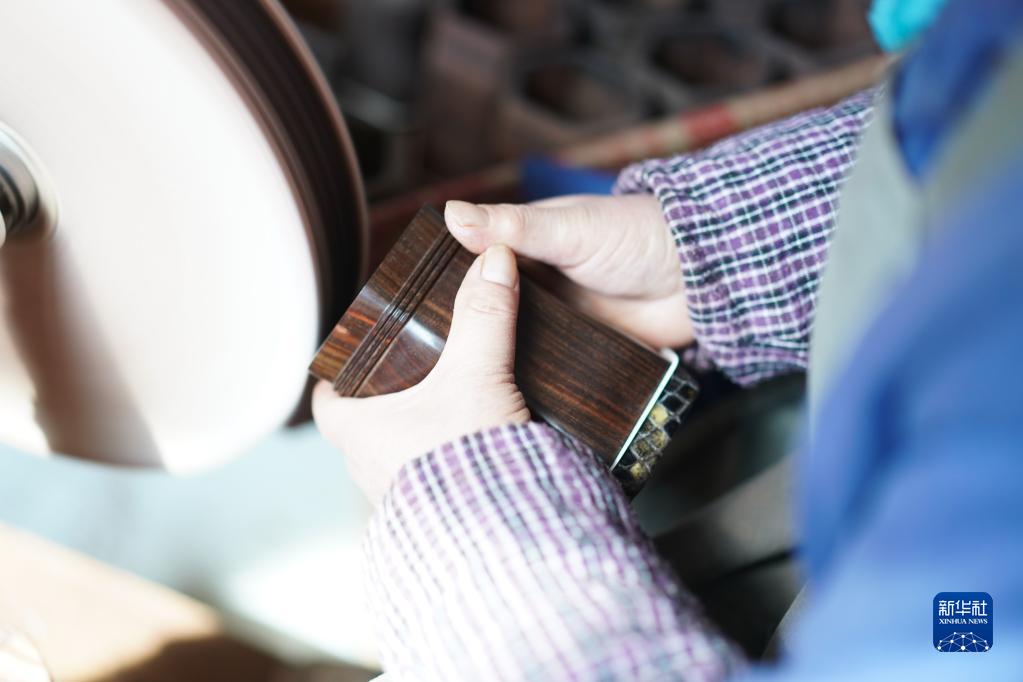 3月28日,在江蘇無錫梅村街道二胡產業園古月琴坊車間,工人在對琴筒進行拋光。