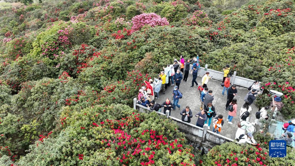 3月27日,游客在貴州省畢節市百里杜鵑管理區天然野生杜鵑林參觀游覽(無人機照片)。