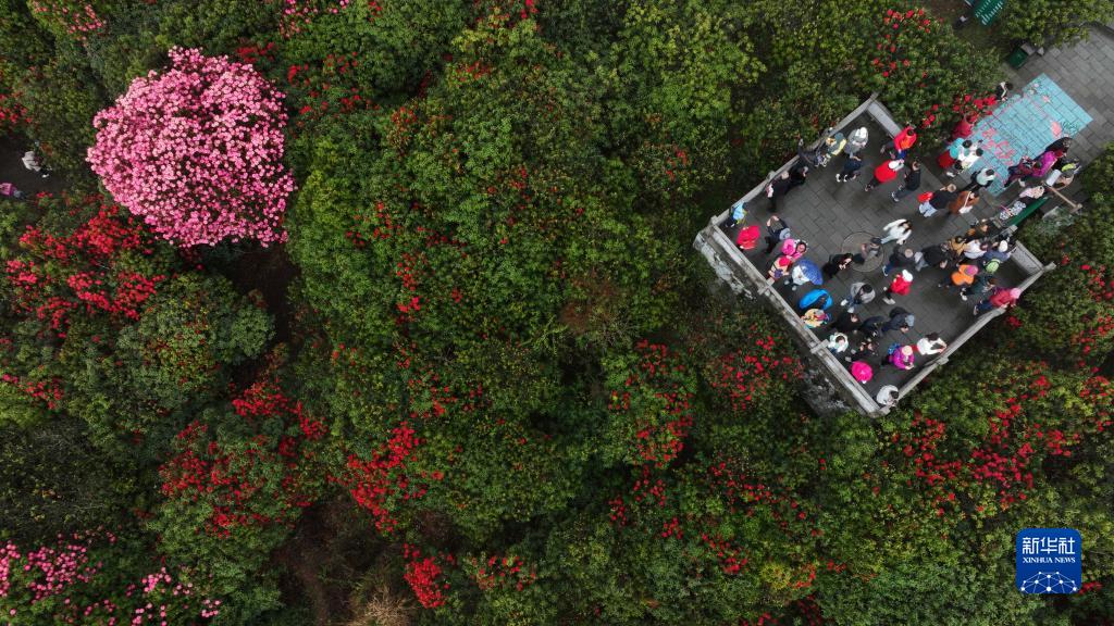 3月28日,游客在貴州省畢節市百里杜鵑風景區賞花(無人機照片)。