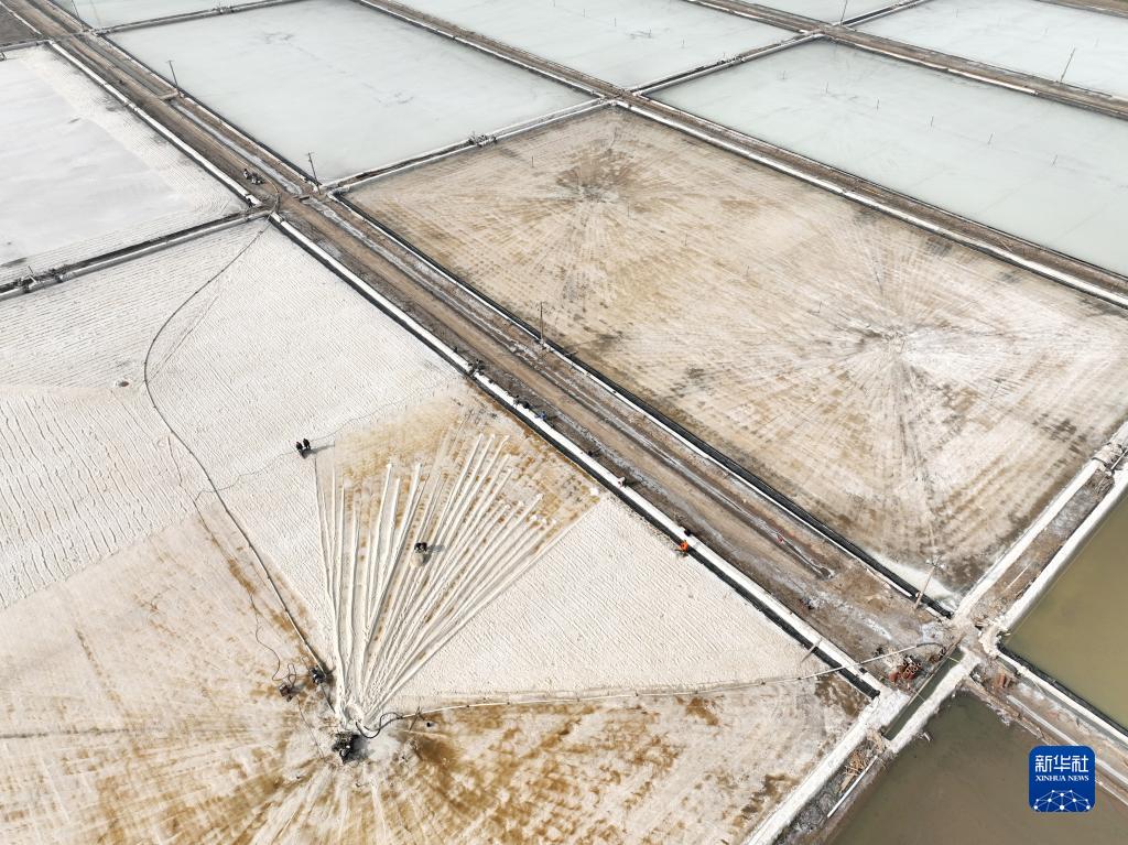 3月28日,在江蘇省連云港市大浦鹽田,工人在鹽田里進(jìn)行“春扒”作業(yè)(無(wú)人機(jī)照片)。