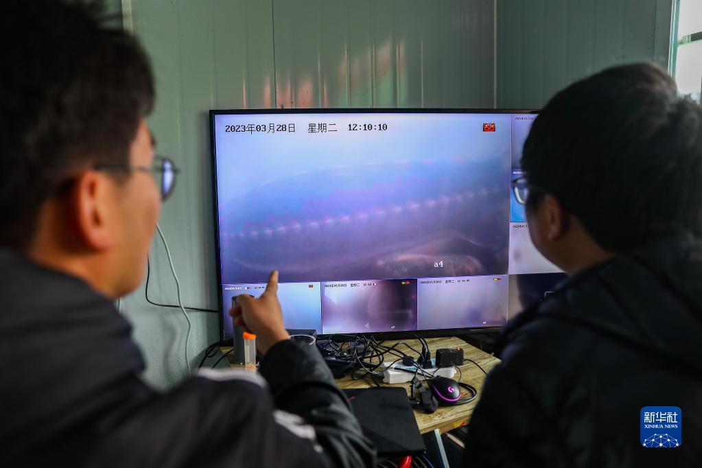3月28日,在四川省宜賓市江安縣長江鱘野化繁殖試驗駐地,研究人員通過水下攝影機觀察長江鱘親魚的活動情況并進行記錄。