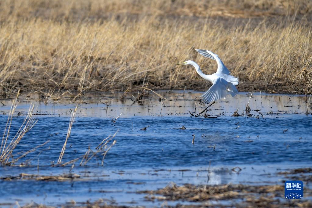 3月28日,在吉林省白城市鎮(zhèn)賚縣,一只大白鷺在濕地棲息。