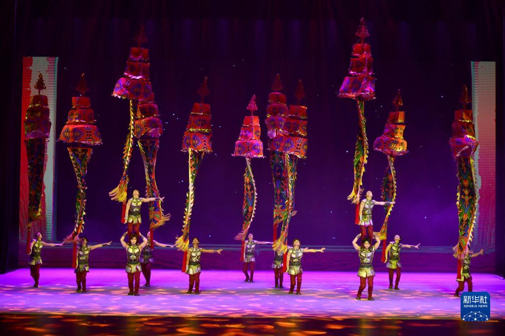 3月28日,在位于山東省濟南市的山東省會大劇院,演員表演雜技節目《龍躍神州·中幡》。
