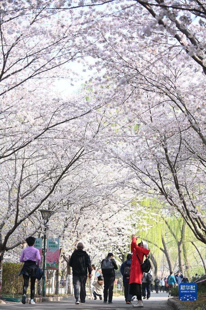 3月29日,游客在北京玉淵潭公園觀賞盛開的櫻花。