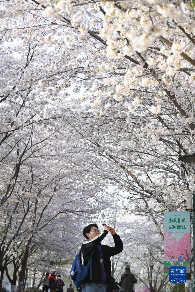 3月29日,游客在北京玉淵潭公園觀賞盛開的櫻花。