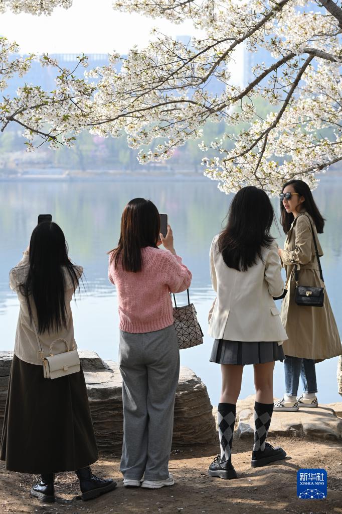 3月29日,游客在北京玉淵潭公園觀賞盛開的櫻花。
