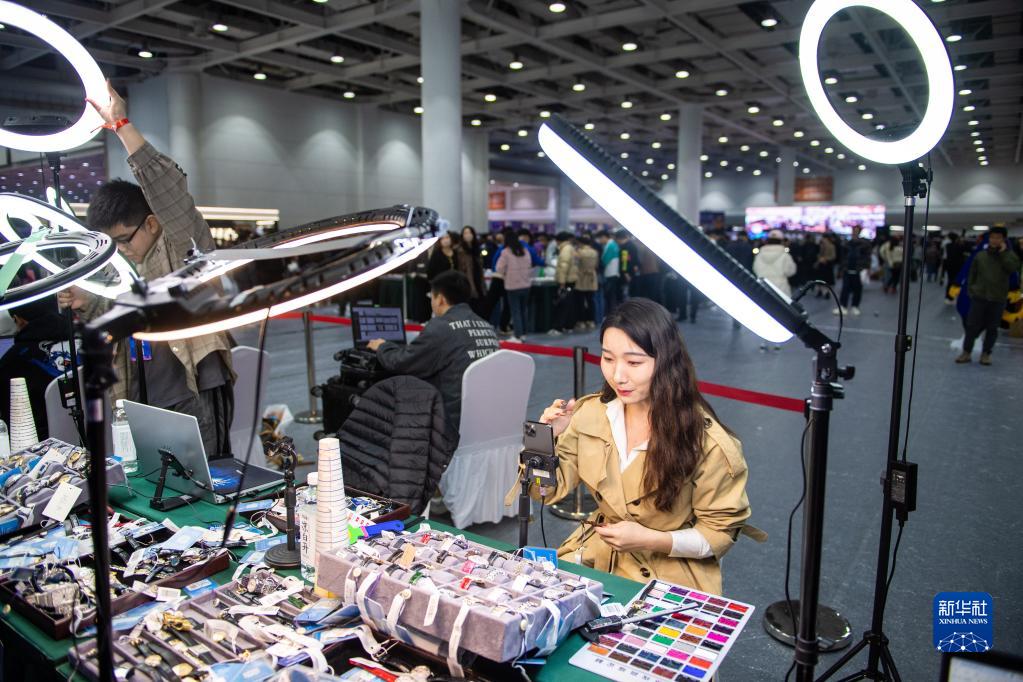 3月29日,在湖南國際會展中心,一名女子通過直播推銷商品。