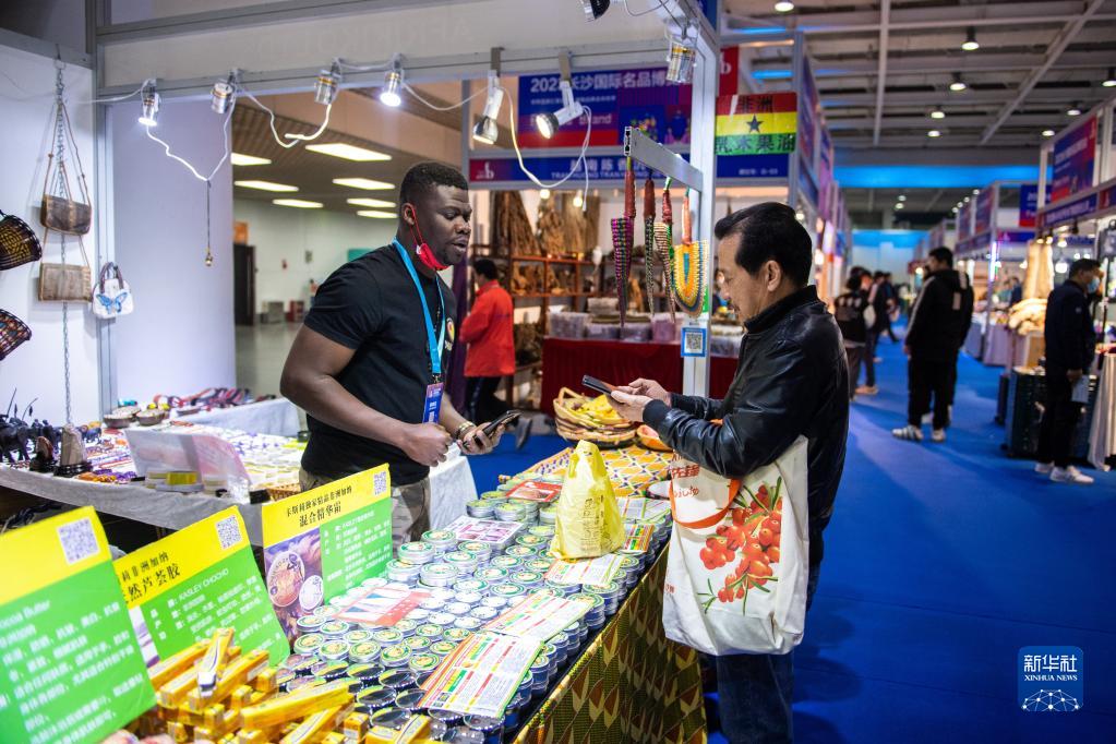 3月29日,在湖南國(guó)際會(huì)展中心,參展商(左)向觀眾介紹加納商品。