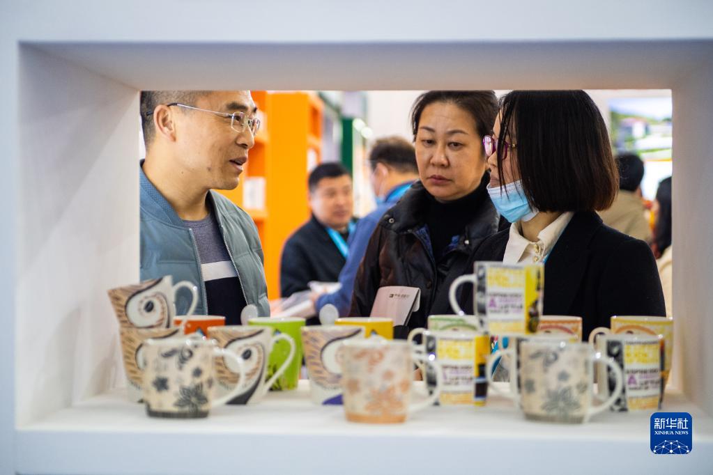 3月29日,在湖南國際會展中心,參展商(右一)向觀眾介紹展出的瓷器。