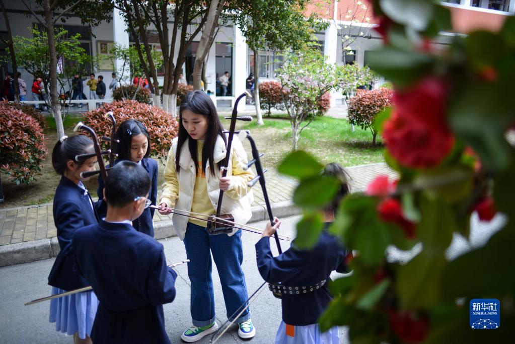 3月29日,在江蘇無錫梅村實(shí)驗(yàn)小學(xué),實(shí)習(xí)老師潘奕如教學(xué)生演奏二胡。她是師范音樂學(xué)科大學(xué)生,主攻二胡專業(yè)。