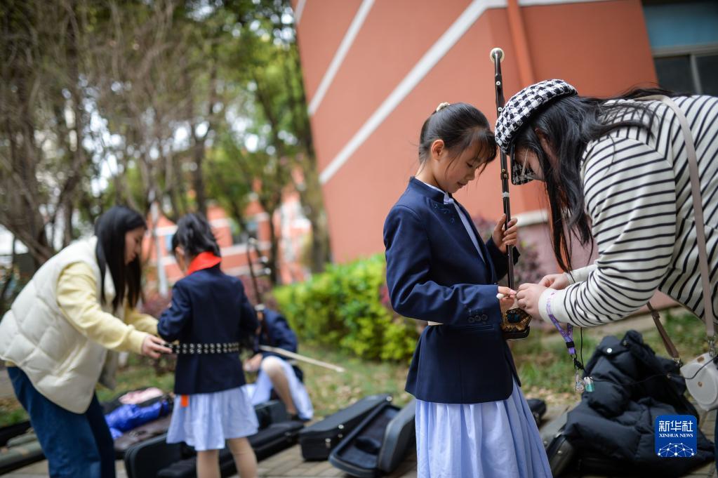 3月29日,在江蘇無錫梅村實(shí)驗(yàn)小學(xué),老師幫學(xué)生整理演奏二胡所需的腰帶。