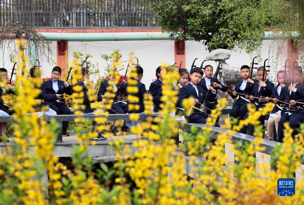 3月29日,江蘇無錫梅村實驗小學學生集體演奏二胡。