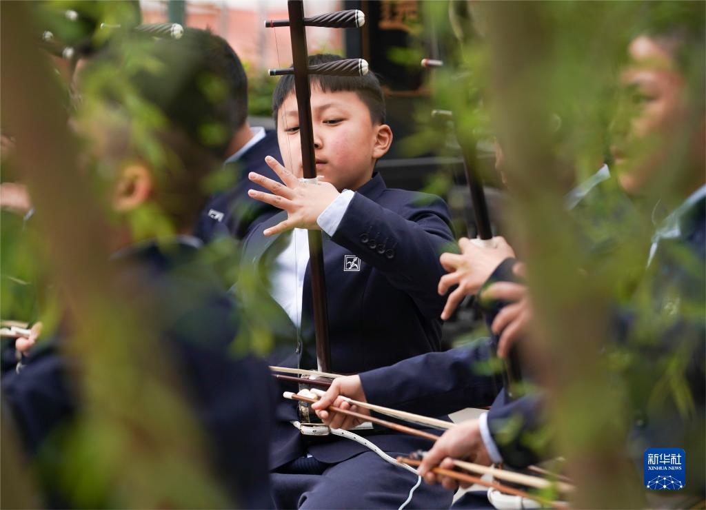 3月29日,江蘇無錫梅村實驗小學學生在演奏二胡。