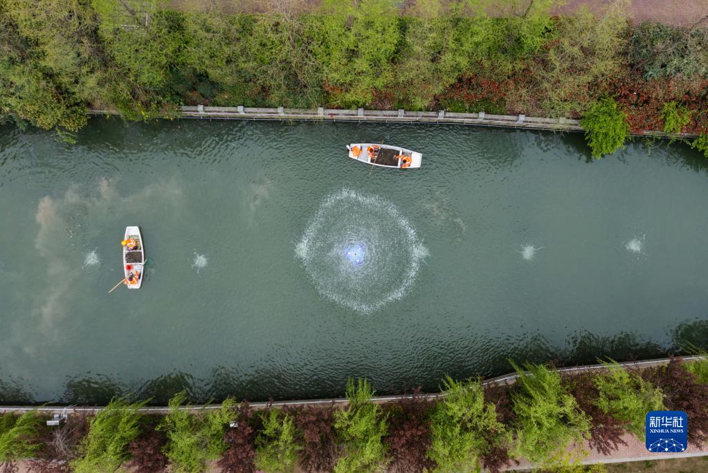 3月29日,龍泉街道工作人員乘船在市陌河里投放螺螄,改善水質(無人機照片)。