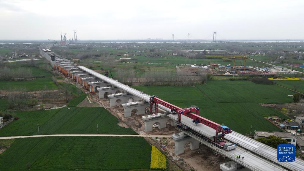 這是3月29日拍攝的中鐵四局巢馬城際鐵路箱梁架設(shè)現(xiàn)場(無人機(jī)照片)。